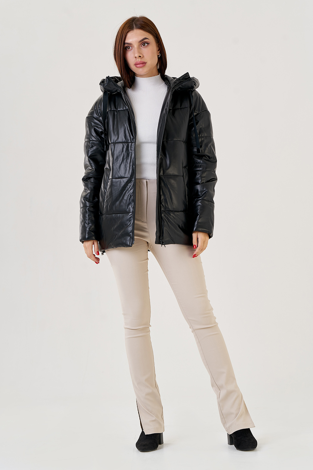 Пуховик в классическом черном цвете с капюшоном. Модель выполнена из эко кожи, что позволяет ей быть надежной и эластичной. Капюшон укроет от осадков. Рукава с напульсниками защитят от ветра. По бокам имеются карманы. Пуховик утеплен верблюжьей шерстью, которая защитит вас в зимние холода.