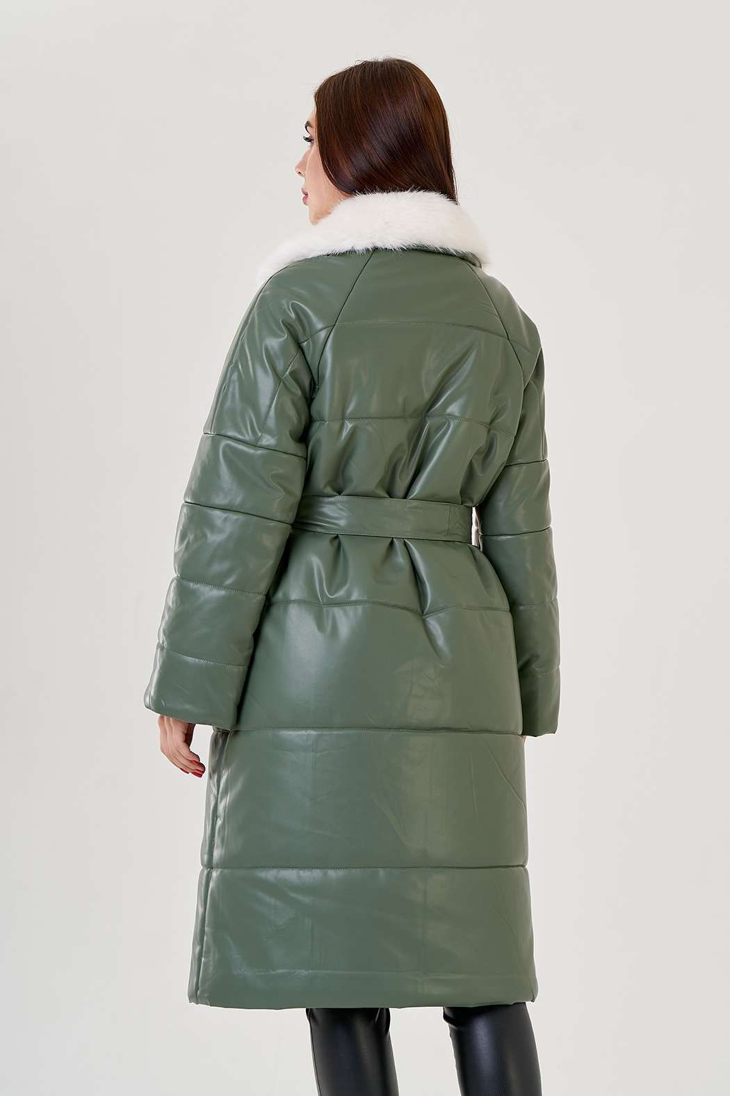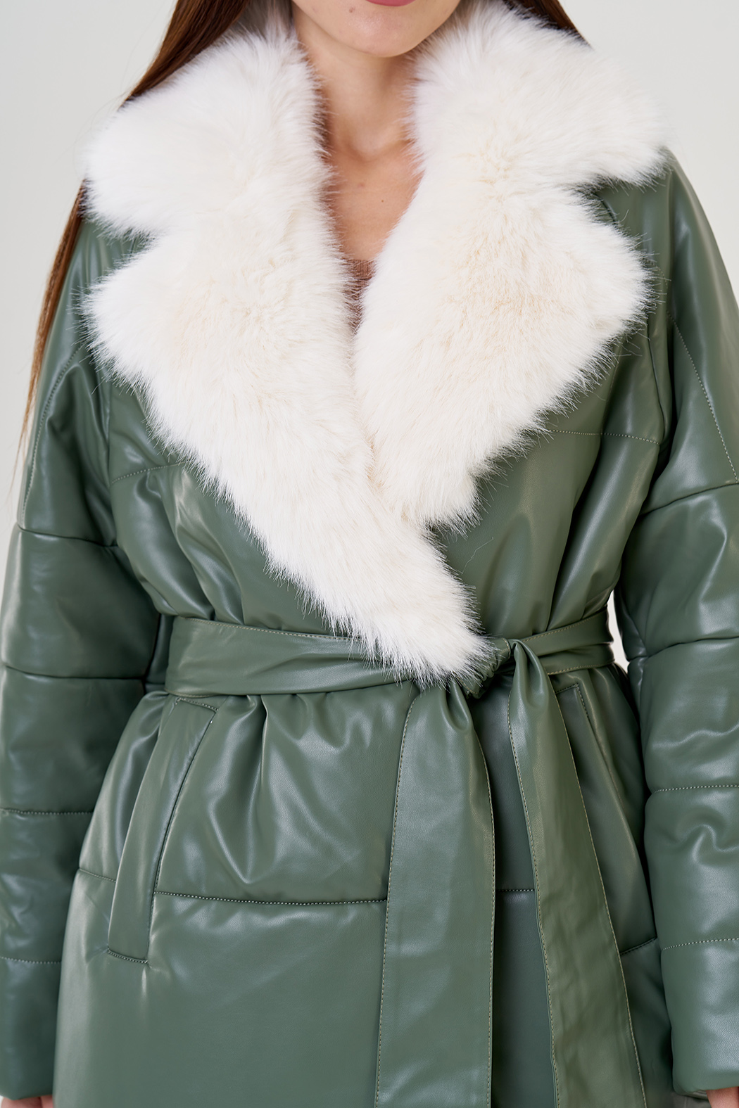 Пуховик в зеленом цвете с воротником из эко меха. Модель выполнена из эко кожи, что позволяет ей быть прочной и эластичной. Меховой воротник отстегивается. Английский ворот подчеркнет вашу шею. По бокам имеются прорезные карманы. В комплекте идет пояс из материала верха.